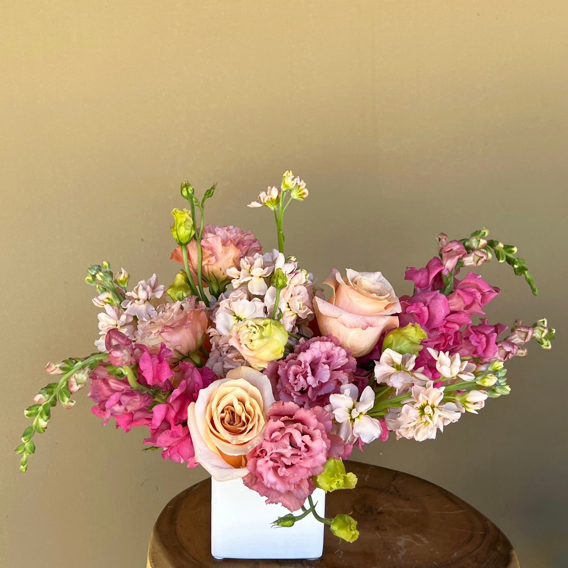 Comparable to the popular Pixie Dust, Fleur is a small arrangement with an all-pink palette. Don't let its small size fool you though, in person this charming arrangement has sprawling elements such as snapdragons and stock with the latter having a subtle fragrance. There are lisianthus and roses which are both ruffly and gorgeous, with buds of lisianthus in light green. Unlike the Pixie Dust, Fleur comes arranged in a modern ceramic container which your recipient can reuse for potting plants.