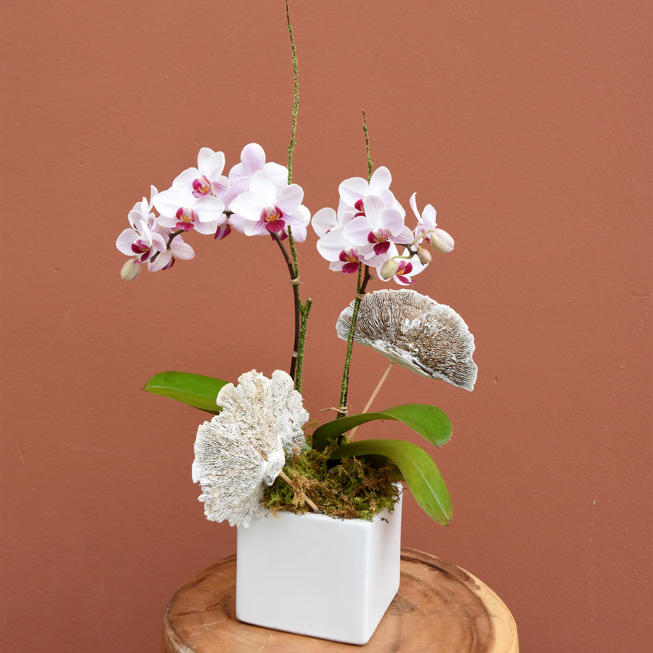 We also include a preserved mushroom in Botanica, a potted orchid arrangement featuring a mini double spiked orchid. We simply love the fairytale feel this arrangement has with the mushroom and moss. Mushrooms naturally have such a fairytale look to them that it adds a touch of magic to this arrangement. It's a wonderful gift for a nature lover and is the perfect size to display on a desk or coffee table.