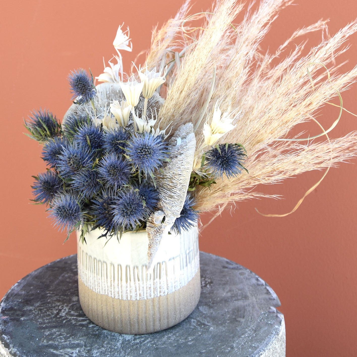 If you want even more dried elements, we have Polly, an arrangement of all dried elements such as thistle, pampas grass, and the addition of two mushrooms. What perhaps makes Polly our best seller from our preserved collection is the soothing color scheme. The mushrooms and pampas grass are a wonderful neutral color while the dark blue of the thistle adds a touch of color without being jarring. It's been especially popular as a home decor gift because it goes so well with any space.
