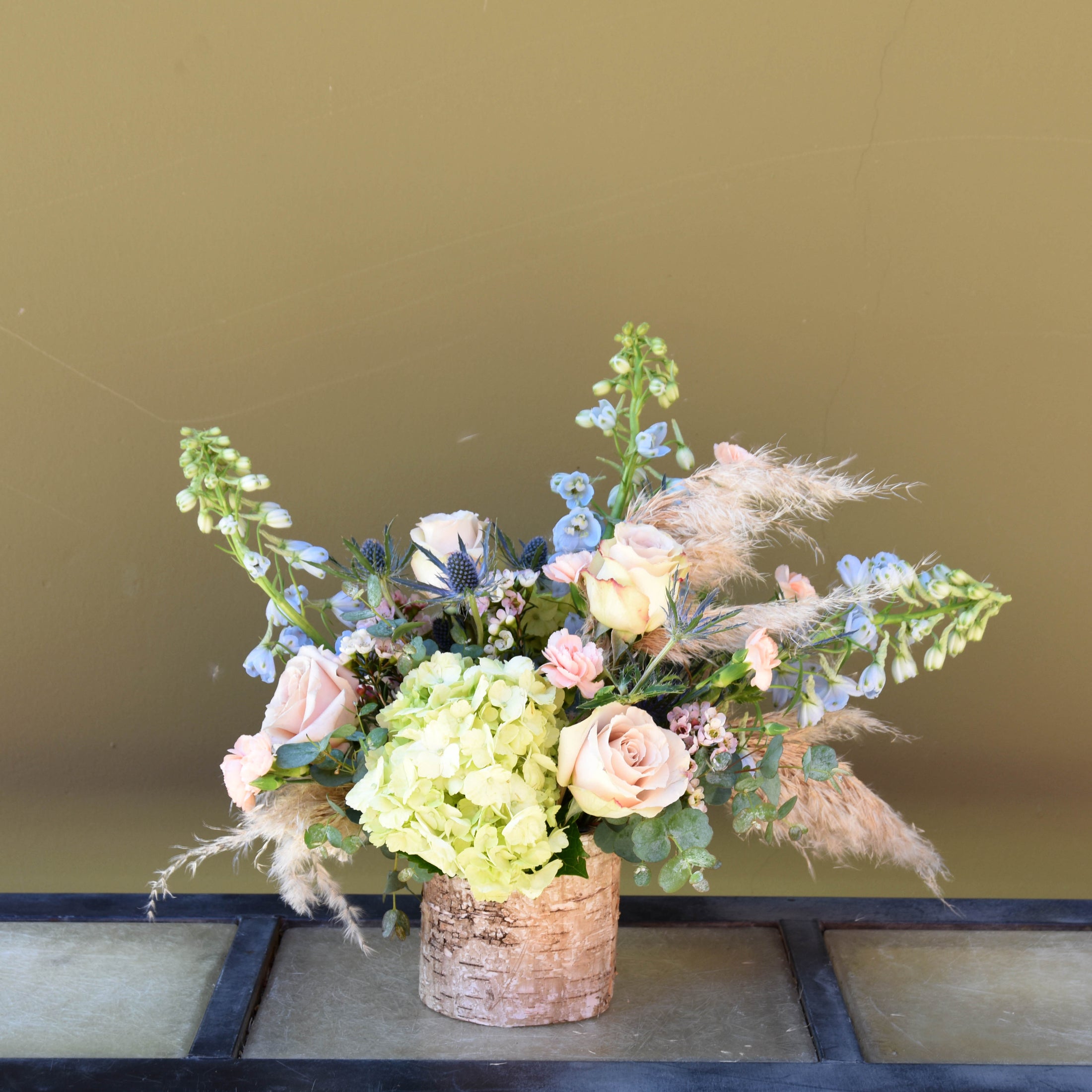 The Golden Oak will remind dad of strolling through the woods especially if he's an outdoor enthusiast. This flower arrangement comes in a birch container and has special touches like pampas grass. The soft blue of the delphiniums is both soothing to the eye and tranquil. Then theres textural elements such as the dark blue thistle that are different and give a rough texture against the lush blooms. Bright green hydrangea is center stage while pops of blush roses make an appearence to keep the arrangement from looking too dark.
