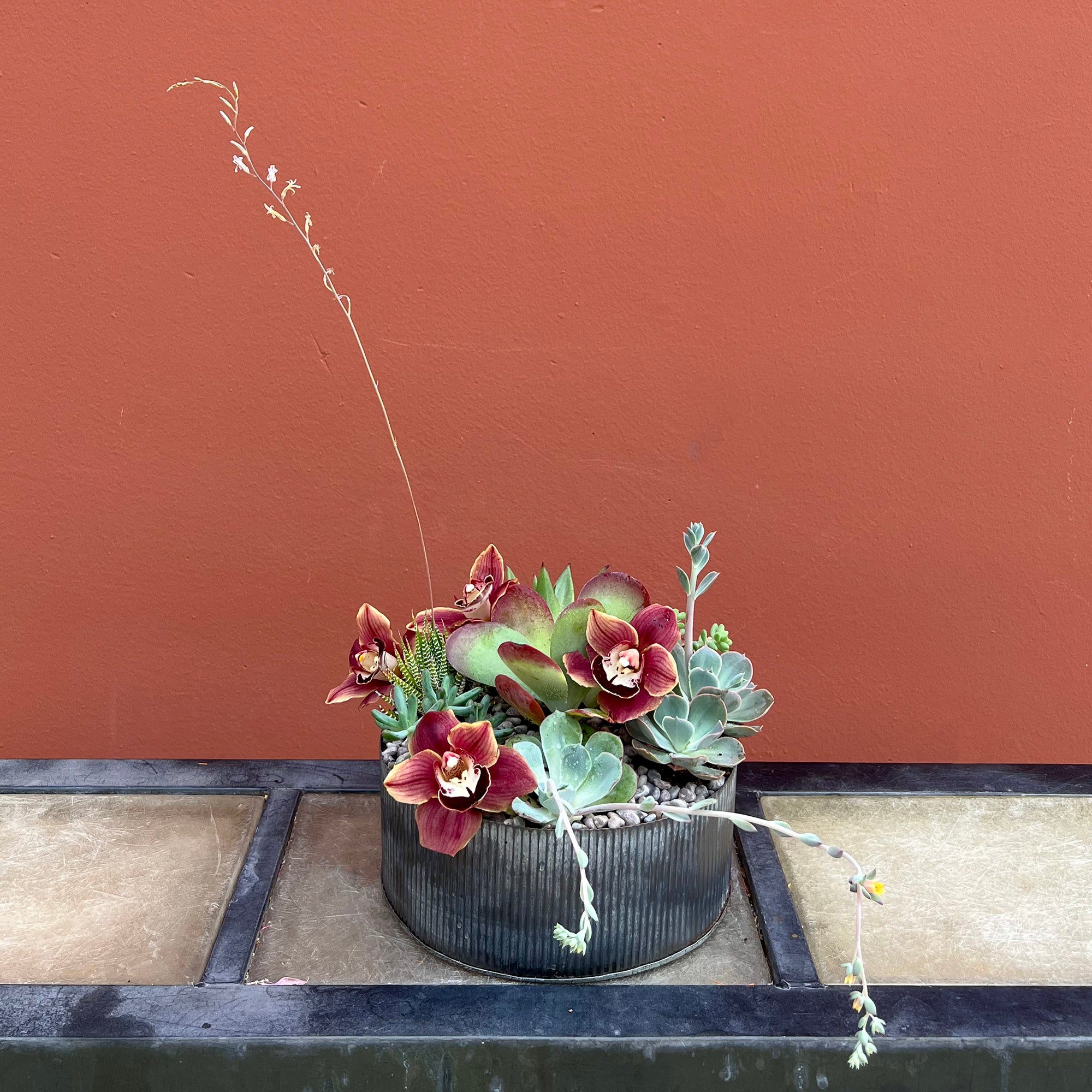 The Metallica's name is derived from the metal container which makes a rustic statement with its ribbed texture. A variety of succulents are potted along with orchid cymbidium blooms which have been added for that special touch. This plant arrangement for dad is utterly unique.