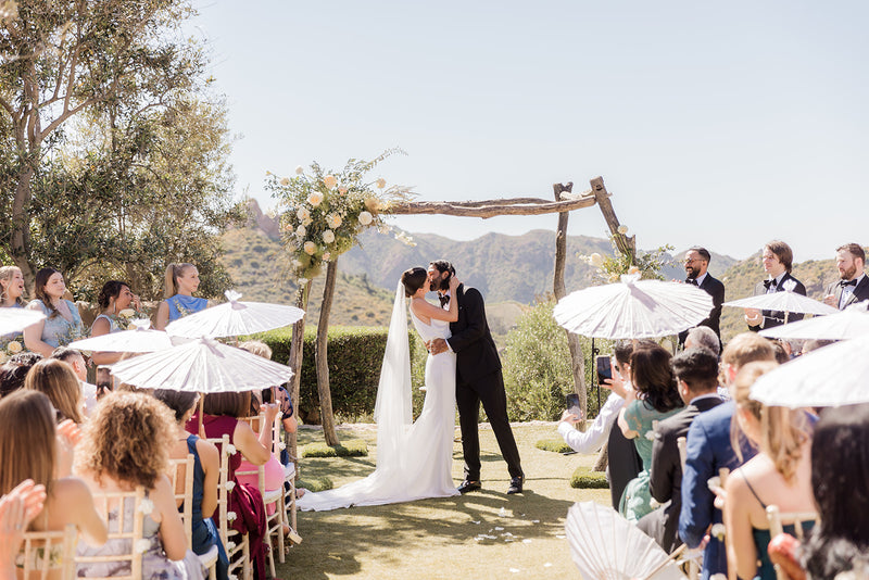 Most couples in Ventura, OC and Los Angeles spend between $3,500-$8,000 on wedding flowers. Smaller weddings (under 75 guests) with simple needs might start around $2,500-$3,500. Larger weddings (150 guests or more) with more elaborate designs typically range from $8,000-$15,000+. Your final cost depends on guest count, flower choices, design complexity, and how many areas need florals (ceremony, cocktail hour, reception, etc.).