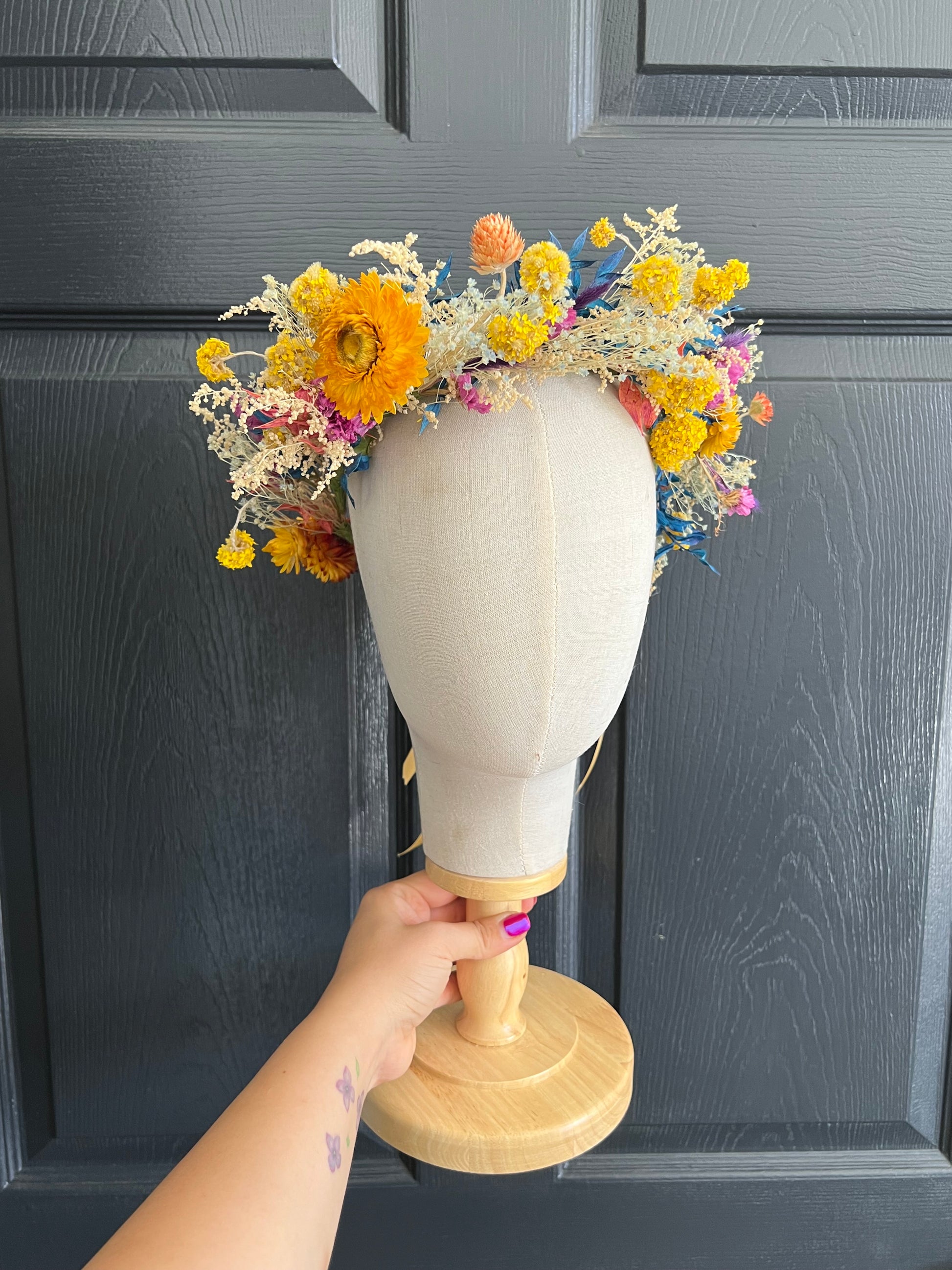 A flower crown featuring dried flowers. Perfect for photoshoots, special events, or to add a little fairy aesthetic to your look.
