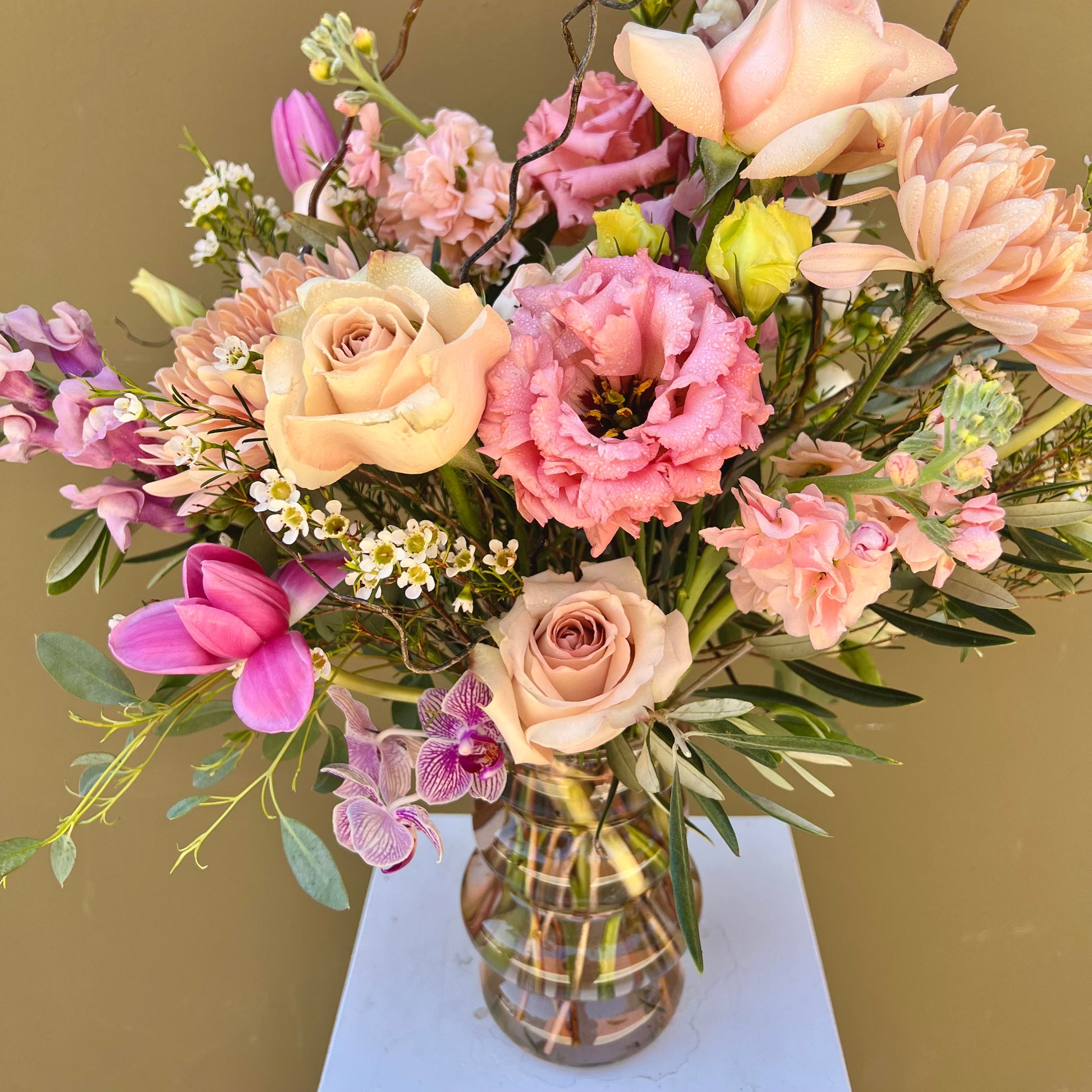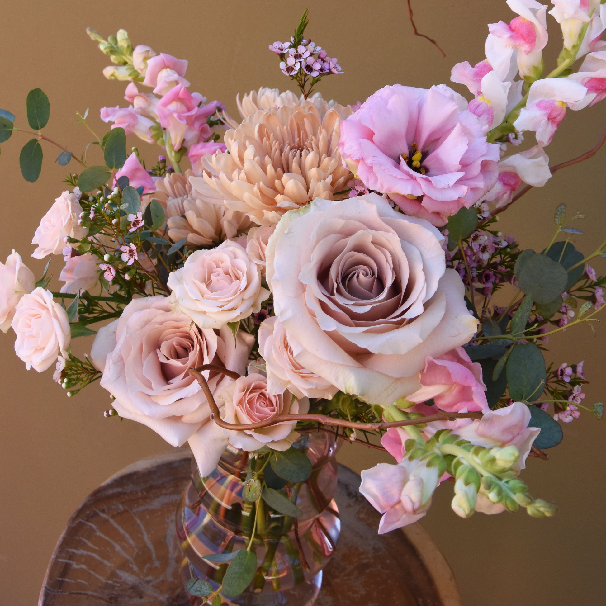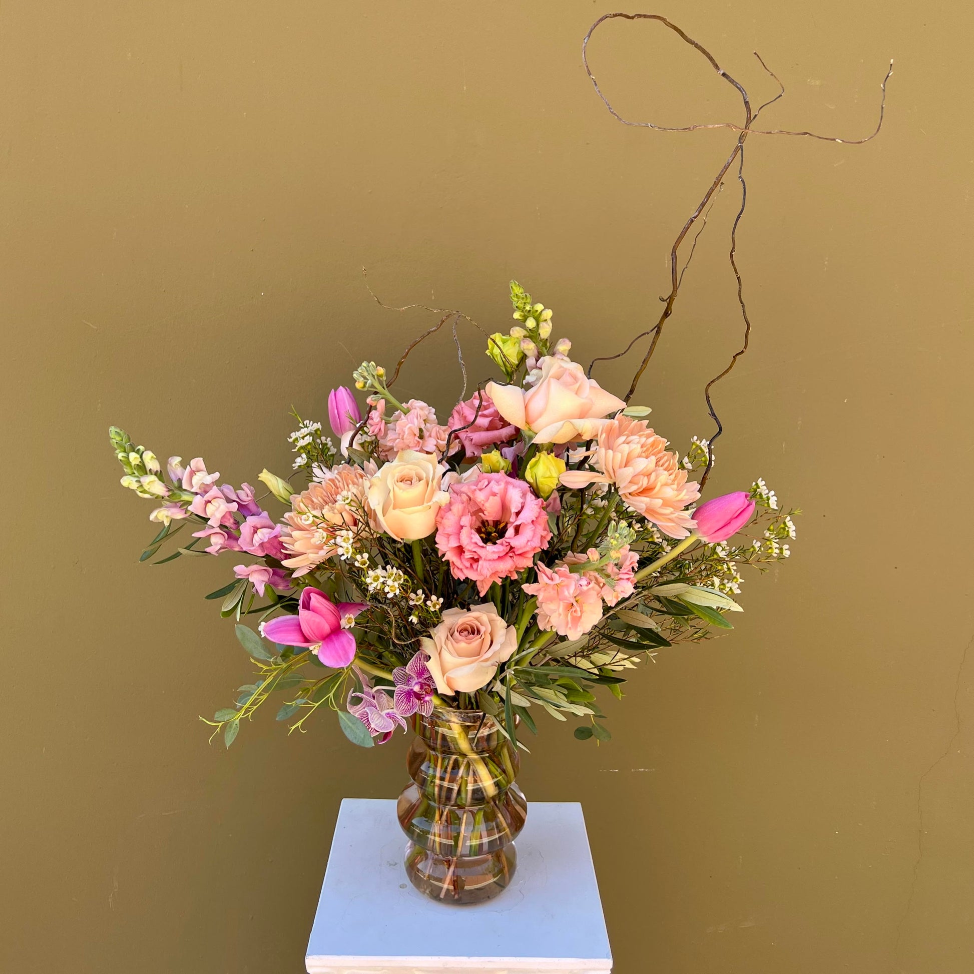 Sprinkle a bit of magic into someone's day with this gorgeous all pink arrangement in a unique vase! Packed with seasonal blooms including roses, wax flower, snapdragons, lisianthus and with some curly willow branches. Sure to delight! Want even more magic? Upgrade to Superior!
