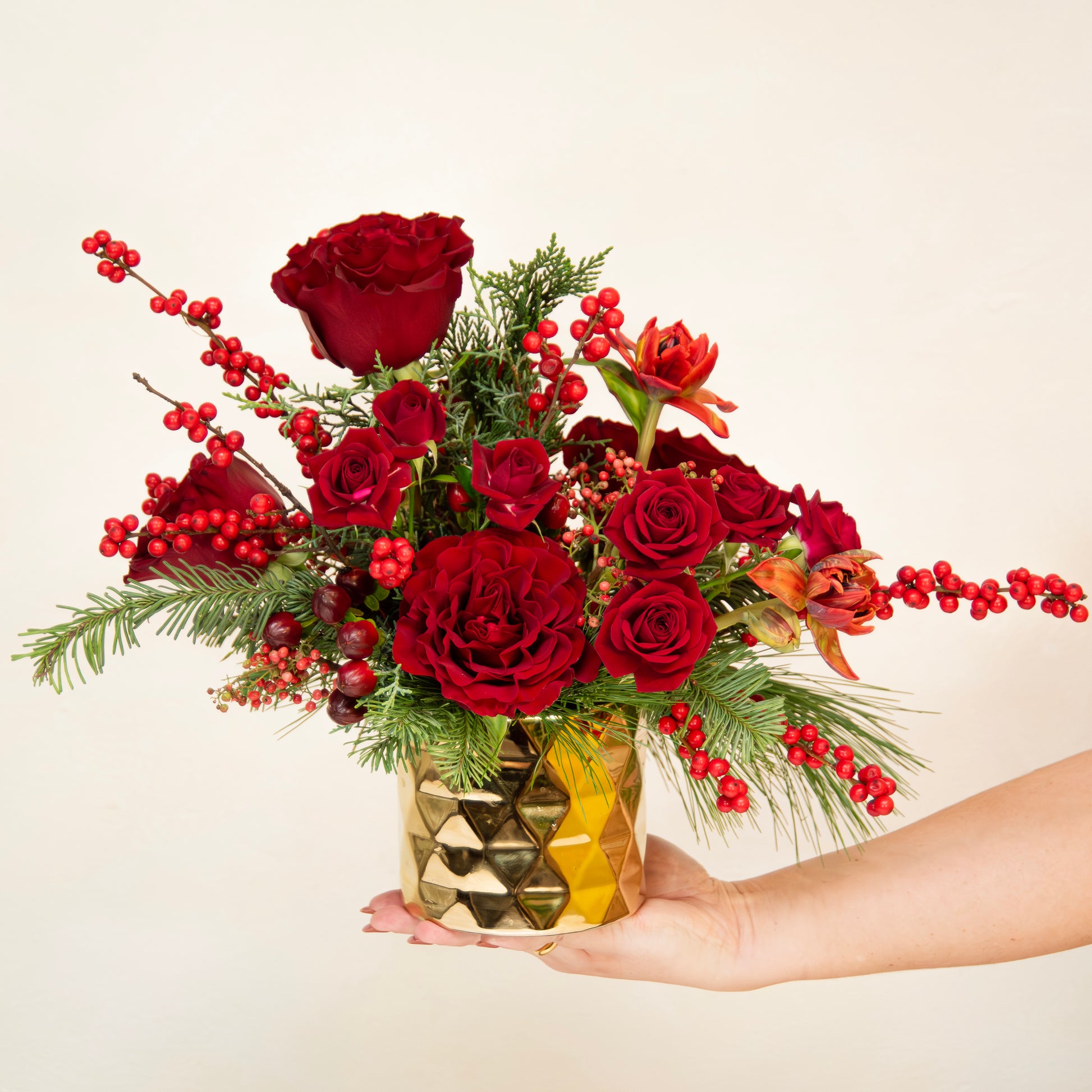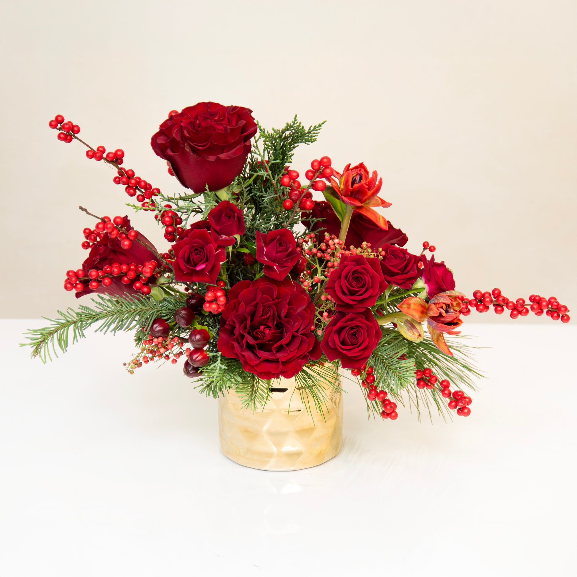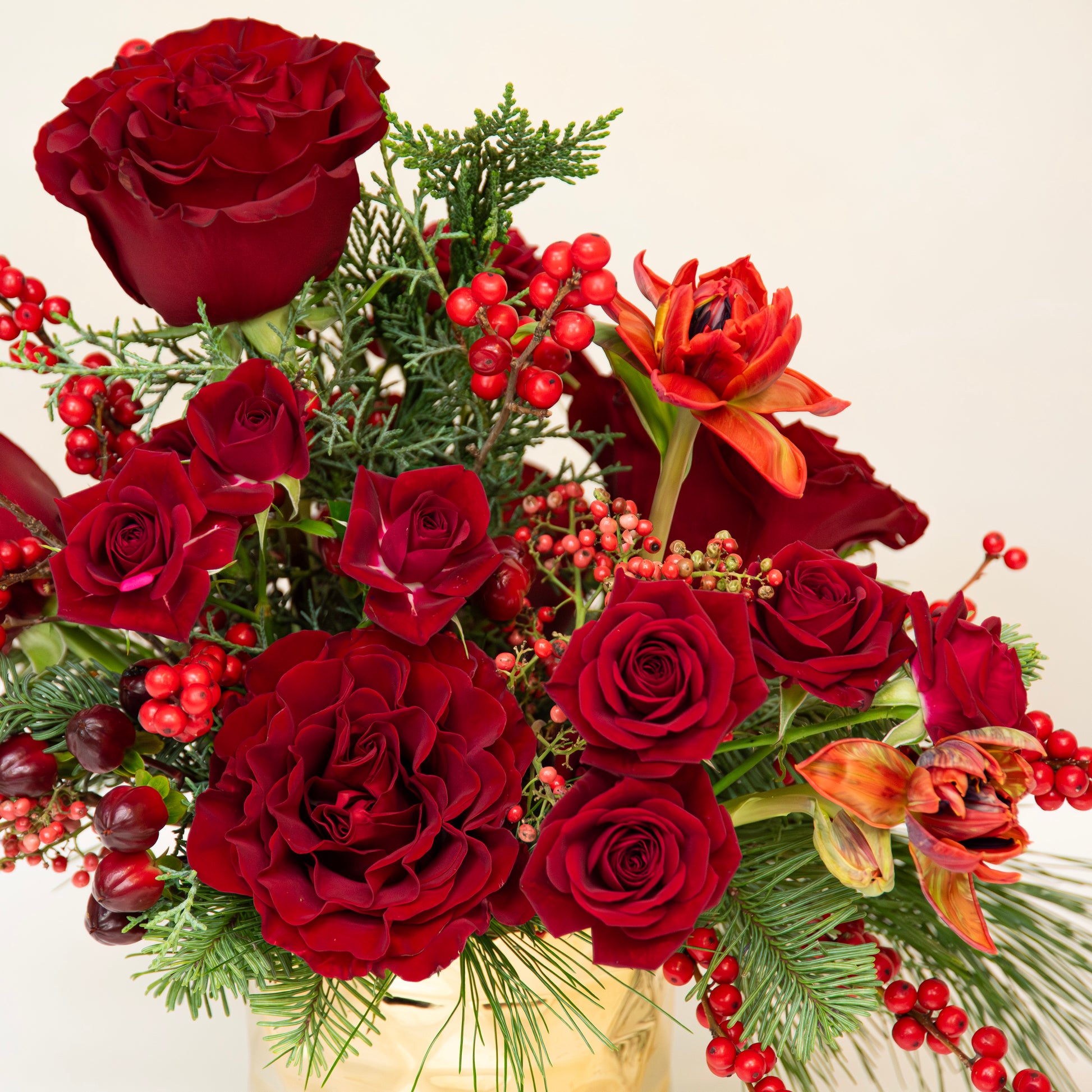 This cheerful Christmas arrangement features fresh red flowers such as roses, tulips, spray roses, and berries along with a mix of Christmas greenery like princess pine and noble fur.