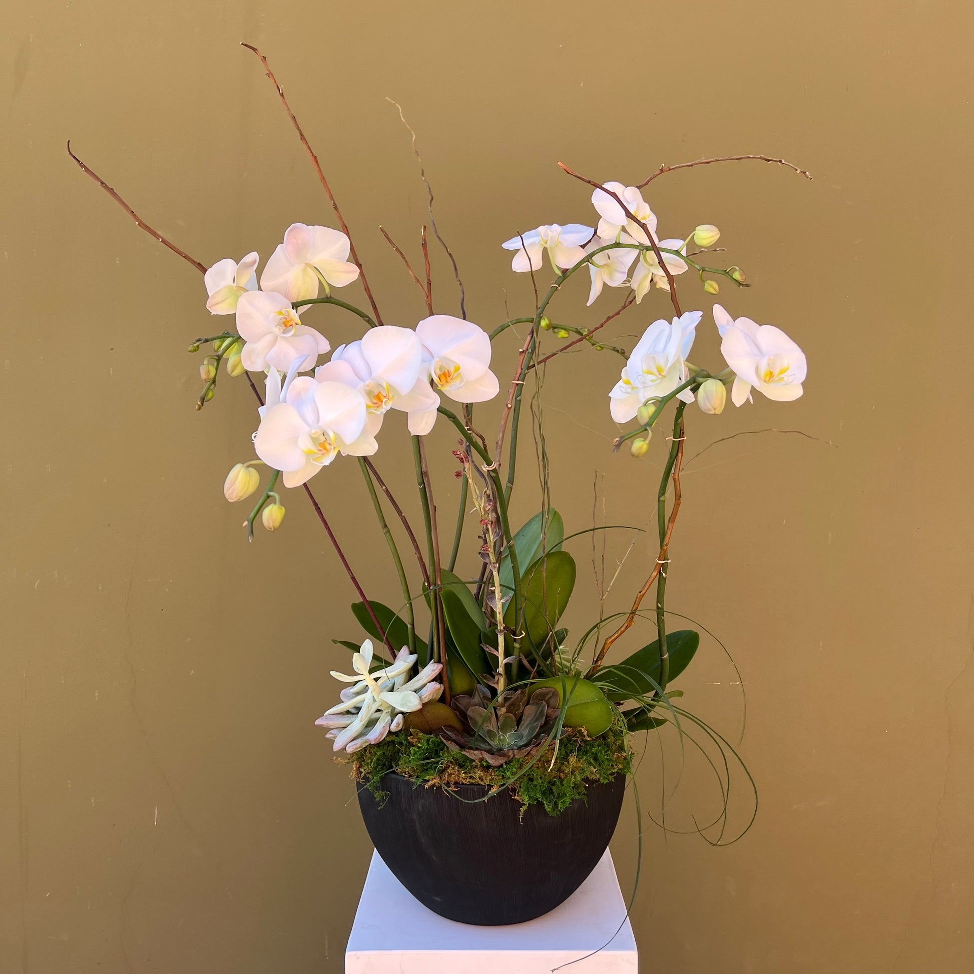 A classic gift for all occasions, a duo of orchids! One of our most popular arrangements, Two to Tango comes in a black textured container with stunning potted phalaenopsis orchids and cute accompanying succulents.