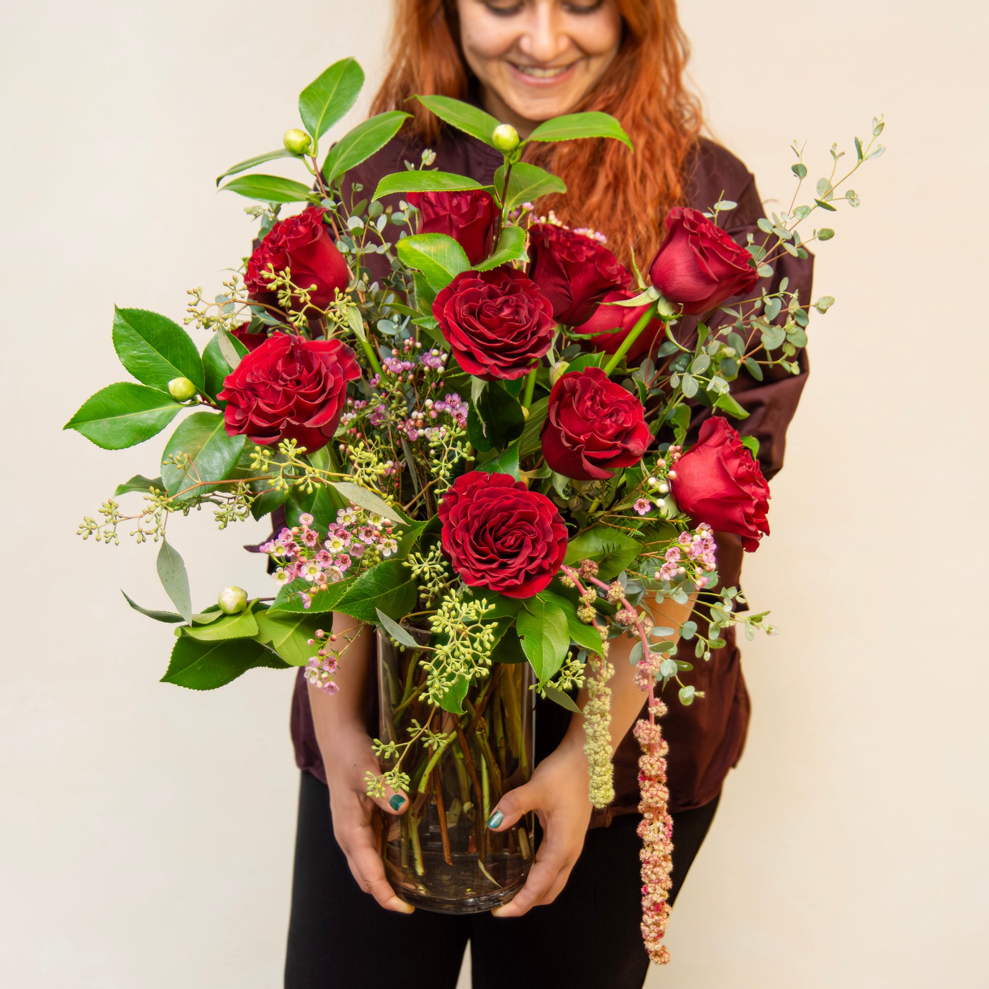 A premium upgraded version of our Valentine's Day dozen rose arrangement featuring high quality roses in red, shades of pink, yellow, white and colorful. In this version, we've modernized the classic arrangement by adding amaranthus, wax flower and unique greenery.
